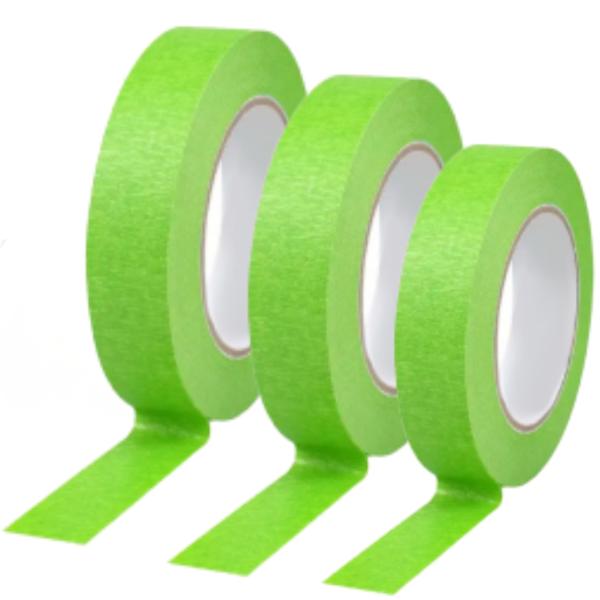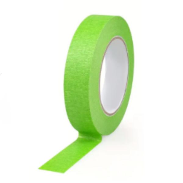 Cinta de carrocero premium verde 18 mm, resistente a 110 °C. Adhesión precisa y retirada limpia. Rollo de 50 metros.