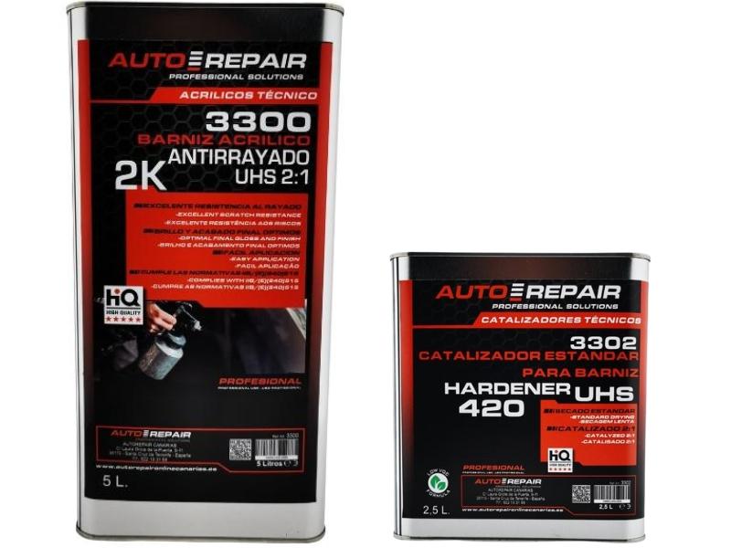 Kit barniz 2K UHS antirrayado 5L + catalizador 2,5L. Brillo intenso, fácil aplicación y gran resistencia.